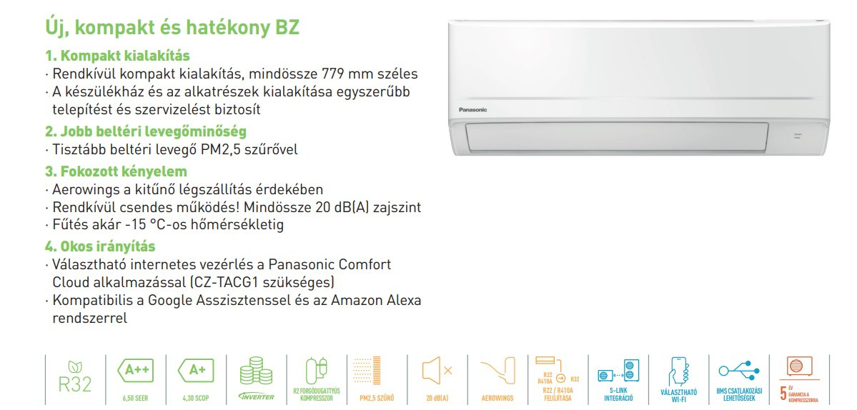 A Panasonic KIT-BZ50-ZKE Standard Inverteres Split klíma fontos tulajdonságai: